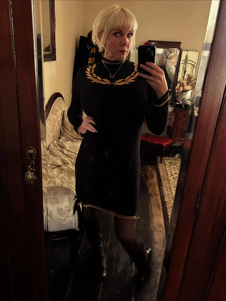 Polo dress, black tights, cardigan, docs or adidas trainers.