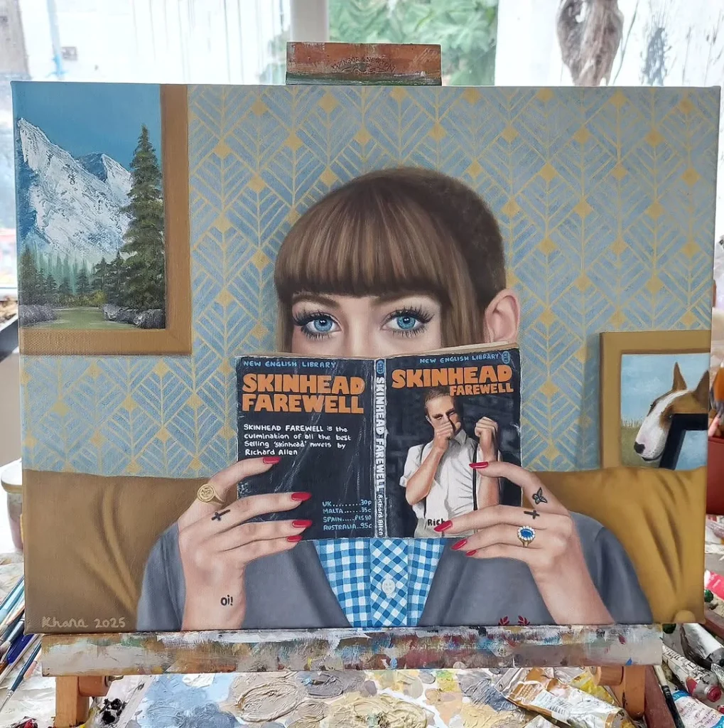 The last painting I completed (girl with skinhead farewell book) it has elements that remind me of my parents. My mum had Richard Allen books around the house and me and my dad use to enjoy watching Bob Ross together.